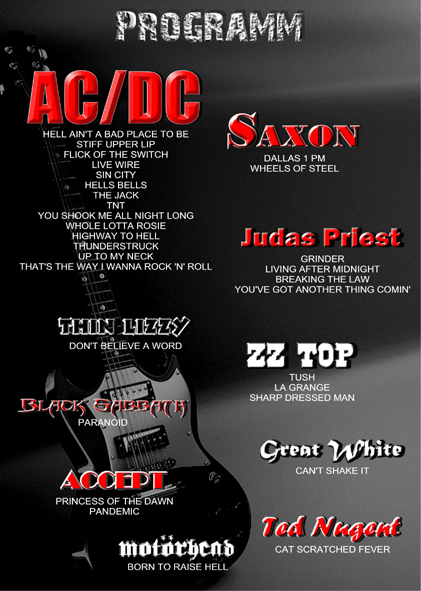 Der Fünfer mit klassischer Besetzung (Gesang, Schlagzeug, Bass und zwei Gitarren) konnte bereits bei zahlreichen Veranstaltungen sein Können eindrucksvoll unter Beweis stellen. Alle Musiker verfügen über umfangreiche Live- und Studioerfahrung und sorgen bei ihren Events immer wieder für mitreißende Stimmung und professionelles Entertainment. Neben vielen bekannten Klassikern aus dem Repertoire von Saxon, ZZ-Top, Judas Priest und anderen Hard und Heavy Größen finden insbesondere ihre gekonnten Interpretationen von zahlreichen AC⚡DC Titeln grossen Anklang beim Publikum. Nicht zuletzt tragen der wirklich fette Sound, das handwerkliche Können der einzelnen Musiker sowie die markante an einen MIx aus Bon Scott und Brian Johnson erinnernde Stimme des Sängers wesentlich zum Erfolg der Band bei.