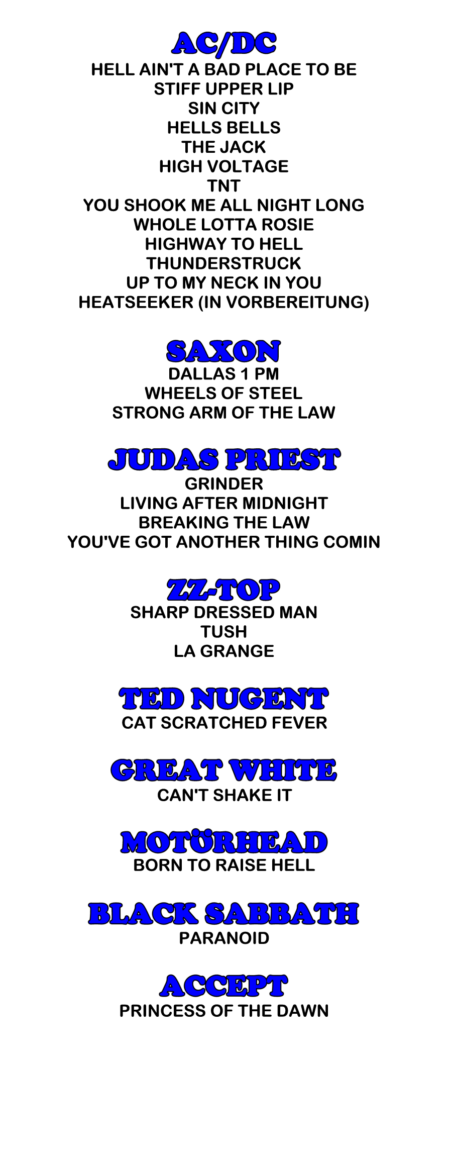 An diesem Konzept hat sich bis heute, auch nach einigen Wechseln in der Besetzung, nichts geändert, wenngleich inzwischen auch einige Stücke legendärer Heavy Metal Bands Einzug in das Repertoire gefunden haben.