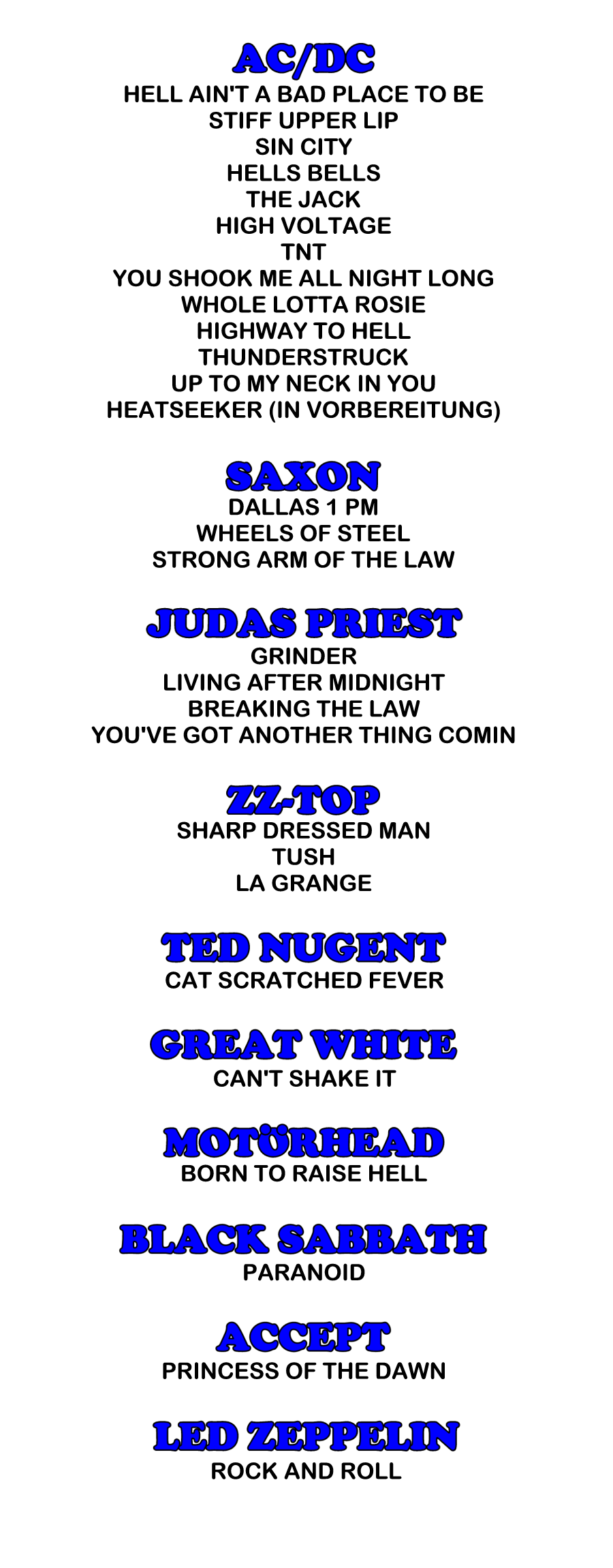 An diesem Konzept hat sich bis heute, auch nach einigen Wechseln in der Besetzung, nichts geändert, wenngleich inzwischen auch einige Stücke legendärer Heavy Metal Bands Einzug in das Repertoire gefunden haben.